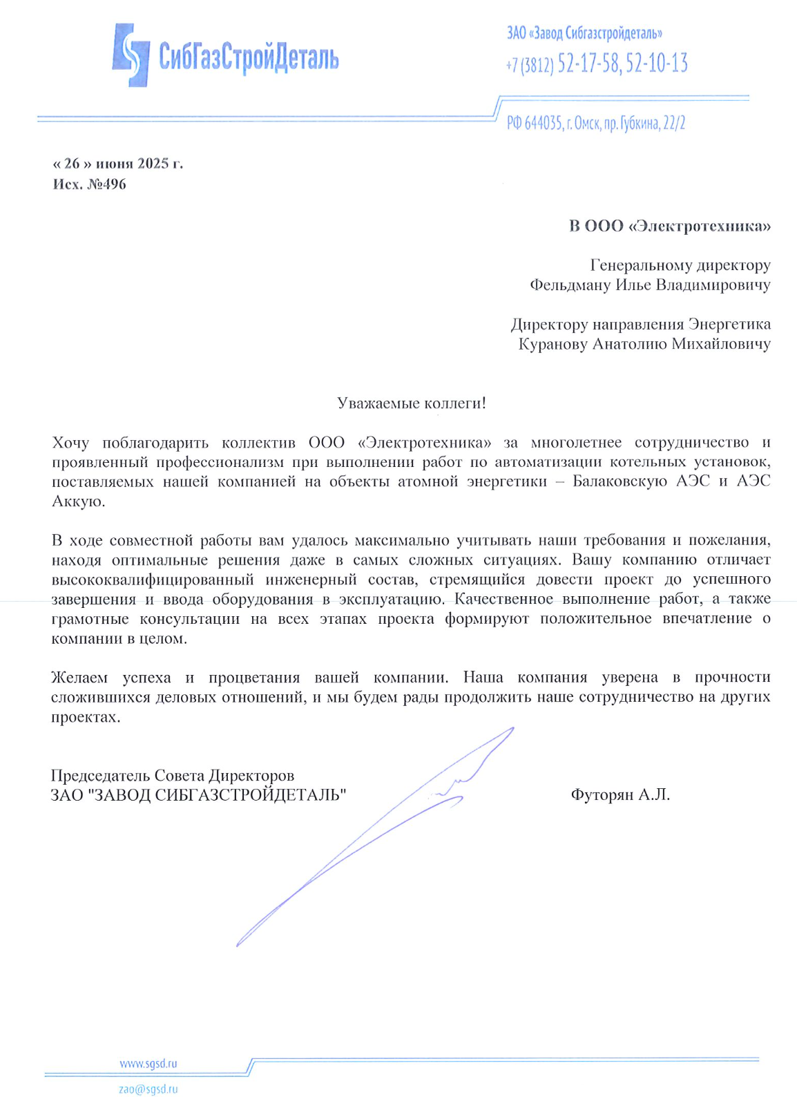 Хочу поблагодарить коллектив ООО «Электротехника» за многолетнее сотрудничество и проявленный профессионализм при выполнении работ по автоматизации котельных установок, на объекты атомной энергетики – Балаковскую АЭС и АЭС Аккую.